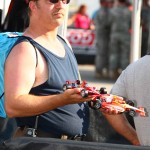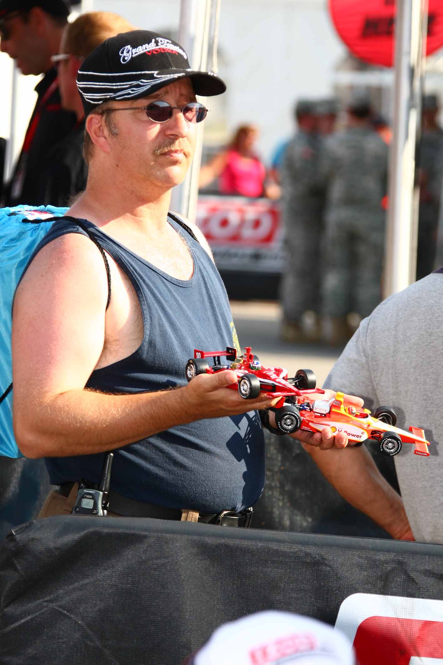 Fã de Helio Castroneves e Dario Franchitti com as respectivas miniaturas durante a sessão de autógrafos no New Hampshire Motor Speedway (Foto BRETT KELLEY/IRL)