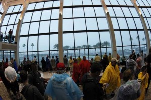 Grupo abrigado da chuva ontem, em St. Petersburg, antes do anúncio de transferência da corrida para esta segunda-feira