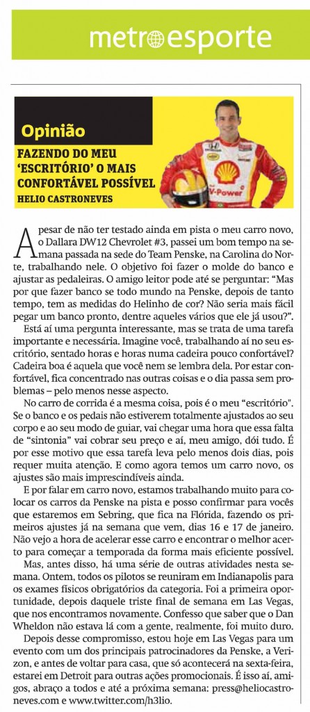 in Helio Castroneves Colunas Helio Castroneves Press Share Facebook Twitter Pinterest Email Coluna Helio Castroneves – Jornal METRO (10.01.2012) on 10 de janeiro de 2012 17 de janeiro de 2012 Share This Previous Post← Galeria Helio Castroneves 2012 – Moldando banco do DW12 na fábrica da Penske Galeria Helio Castroneves 2012 - Moldando banco do DW12 na fábrica da Penske Next PostDiário Motorsport completou três anos no dia 9 → Diário Motorsport completou três anos no dia 9 You May Also Like on 12 de novembro de 2025 A emoção que ainda bate num velho coração