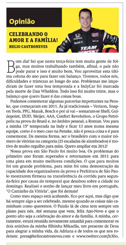 Veja aqui a coluna de Helio Castroneves publicada nesta terça-feira, 13 de dezembro de 2011, no Jornal METRO em suas edições diárias de SÃO PAULO, RIO DE JANEIRO, CURITIBA, BELO HORIZONTE, PORTO ALEGRE, CAMPINAS, ABC PAULISTA e SANTOS, num total de 440 mil exemplares.