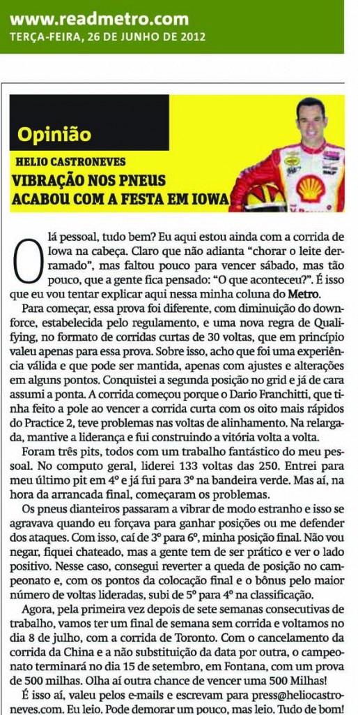 Coluna nº 114 de Helio Castroneves – Jornal METRO (26.06.2012)