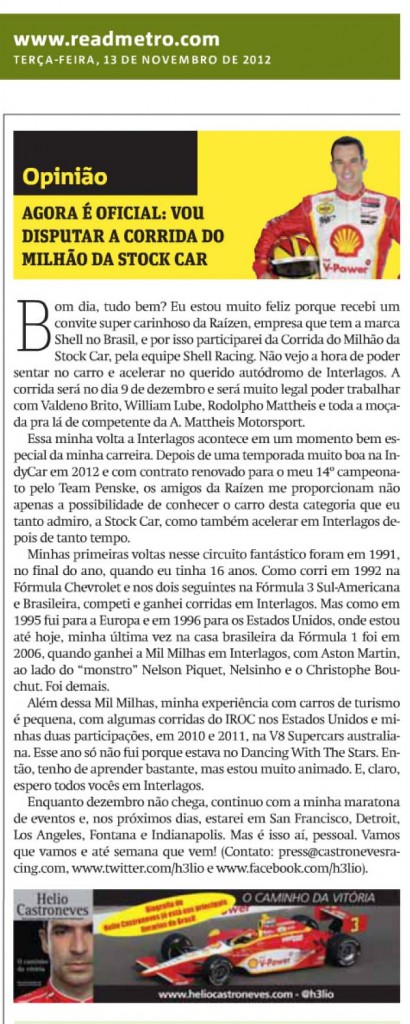Coluna nº 134 de Helio Castroneves – Jornal METRO (13.11.2012)