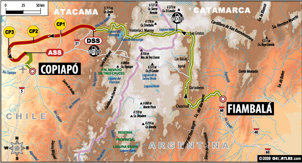 Ao final de três dias de especiais, três competidores vão descansar nesta segunda-feira na condição de classificados entres os dez primeiros da categoria Carros. O piloto brasileiro Guilherme Spinelli e o navegador português Filipe Palmeiro (322) levaram o Mitsubishi Racing Lancer da Equipe Mitsubishi Brasil/JMB Stradale ao 10º posto na classificação geral, nesta terceira etapa do Dakar 2010 (La Rioja e Fiambala). Na especial de 182 km, que representou o primeiro encontro com as dunas, a dupla luso-brasileira registrou o tempo de 3h36min19s. Tal resultado, além de representar um avançar de dez posições em relação ao dia anterior, permitiu também que Spinelli passasse a ocupar a melhor posição entre os brasileiros na categoria geral. Isso porque, após três etapas, ele e Palmeiro figuram em 8º lugar. Apesar do resultado, foram obrigados a parar no percurso em três oportunidades para pequenos reparos.