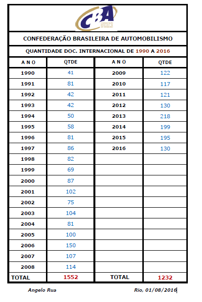 DADAI – Temos representatividade em diversas categorias, notoriamente nossos pilotos têm qualidade, isso é fator determinante e não a quantidade, porém, os números apresentados abaixo mostram que também temos evoluído em quantidade. O fator economia, hoje, impacta diretamente nessa realidade, é preciso entender que os investimentos em uma carreira internacional não são baixos, e com a retração econômica vivida hoje, essa representatividade internacional é sim bem significativa! A estatística apresentada, mostra isso, a quantidade de documentos internacionais no período de 1990 a 2016, com relação a emissão de carteiras internacionais, observa-se que no período de 1990 a 2008 foram confeccionadas 1552 carteiras e no de 2009 a 2016 o total de 1232, ou seja, no período de 8 anos (2009/2016), foram confeccionadas o percentual de quase 80% do que foi feito ao longo de 19 anos (1990/2008).