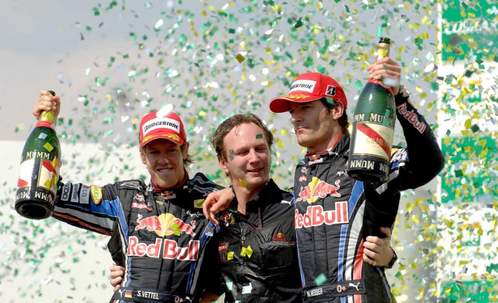 O chefe de equipe Christian Horner, entre o vencedor Sebastian Vettel e Mark Webber, o 2º (Foto MIGUEL COSTA JR.)