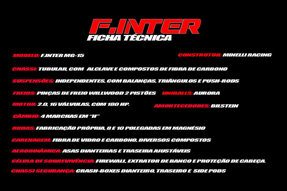 O F-Inter MG-15 foi desenvolvido graças a experiência de mais de 45 anos de quem já fez história no automobilismo brasileiro, e certificado por engenheiros de universidades nacionais, que se valeram das melhores práticas construtivas, dos mesmos softwares utilizados pelos principais fabricantes de veículos de competição em todo o mundo, e dos mais resistentes e avançados materiais, privilegiando a segurança, performance e competitividade.