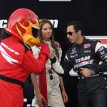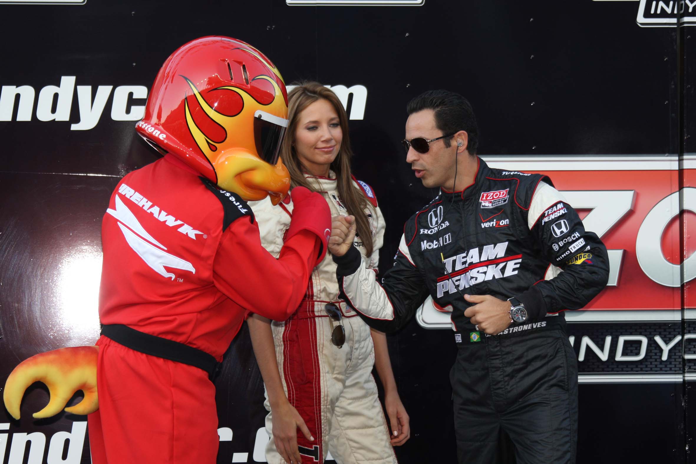 Helio Castroneves na cerimônia que anteceu a largada no Chicagoland Speedway com o mascote da Firestone e a modelo da IZOD (Foto Jim Haines/IRL, Joliet, IL, 28.08.2010)