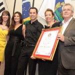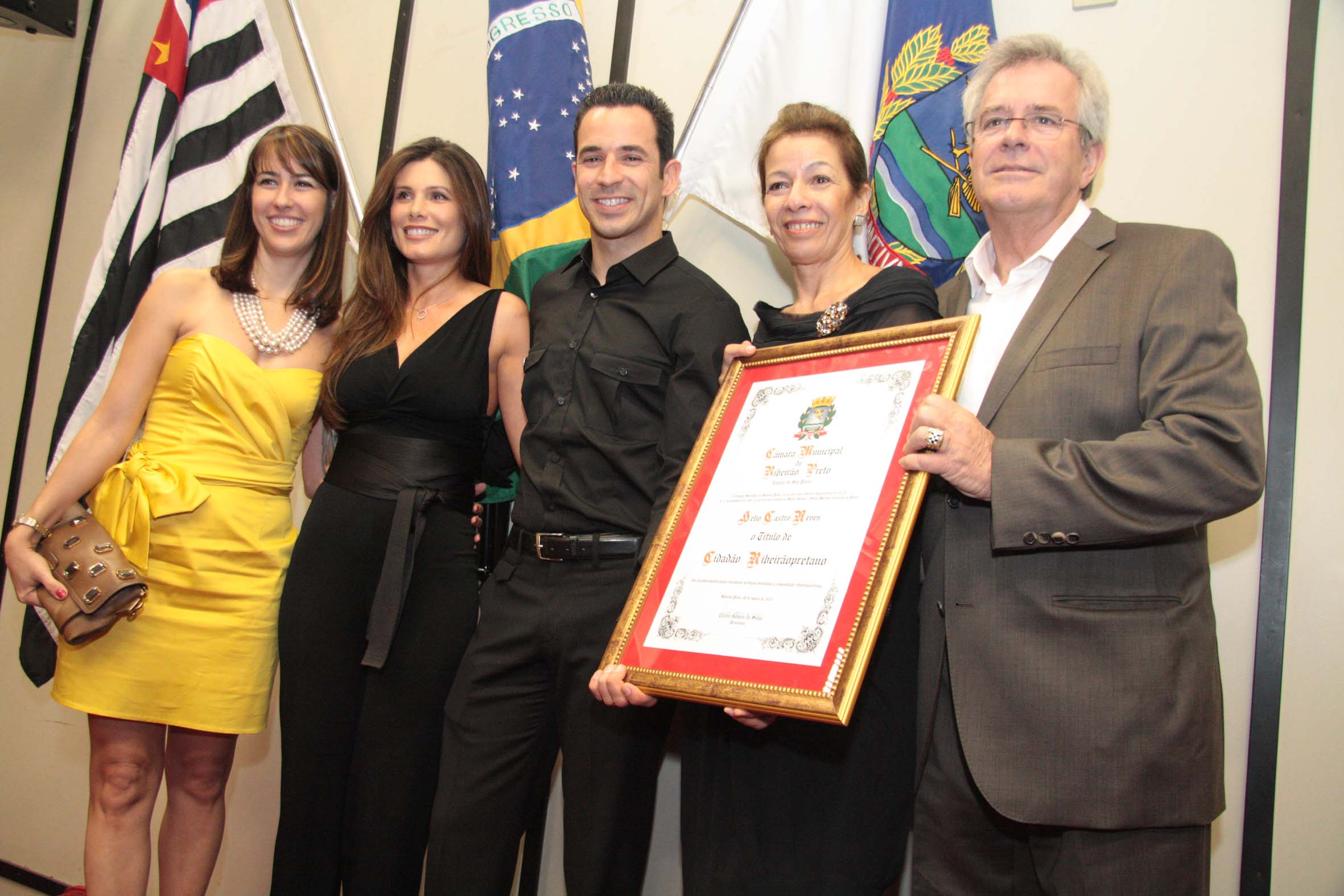 Cerimônia de entrega do título de cidadão ribeirãopretano para Helio Castroneves; na foto, da esquerda para a direita, a irmã Katiucia Castroneves, a namorada Adriana Henao, o piloto, sua mãe Sandra e o pai Helio (Foto PC Falseti, Ribeirão Preto, SP, 08.03.2010)