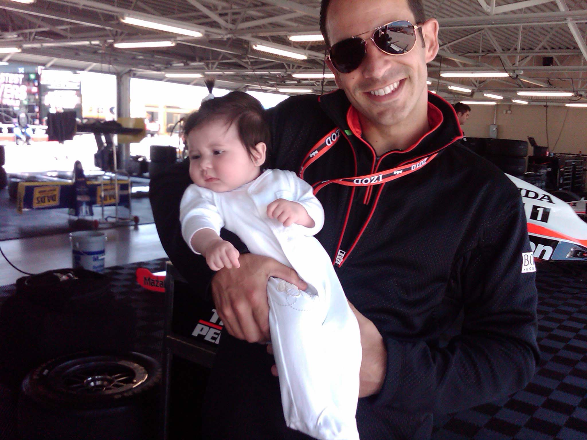 Helio Castroneves e a filha Mikaella nos boxes de Kansas (Foto Arquivo Pessoal, Kansas, USA, 20.04.2010)