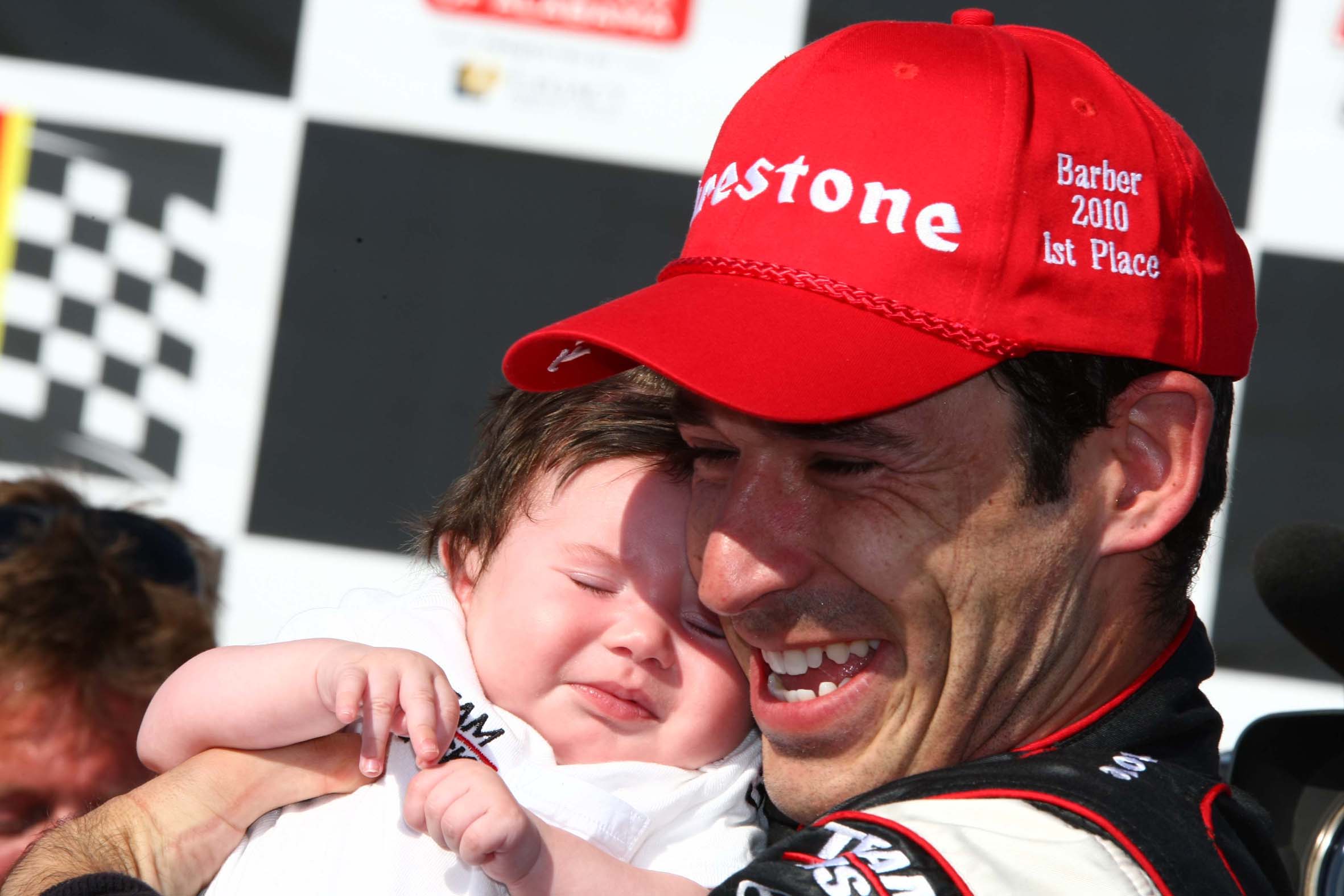 Helio Castroneves comemora no pódio com a filha Mikaella, então com três meses, a vitória no Alabama, terceira etapa da Fórmula Indy 2010 (Foto Don Helrigel/IRL, Birmingham, USA, 11.04.2010)