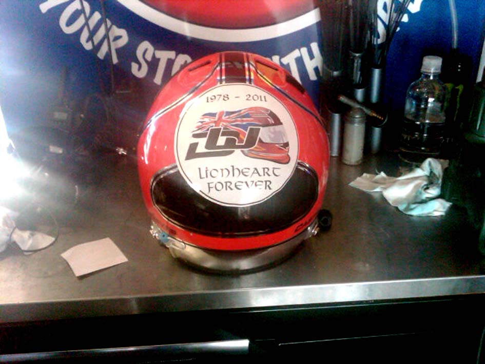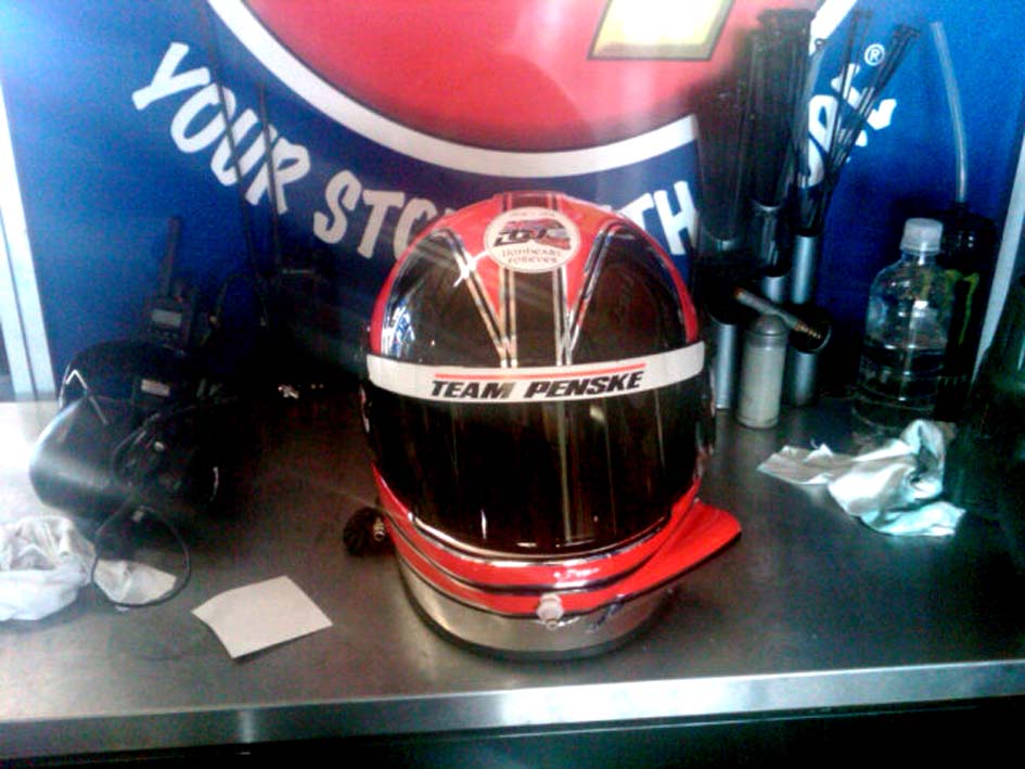O capacete de Helio Castroneves e a homenagem especial do piloto do Team Penske a Dan Wheldon, na Austrália (Foto fornecida por STONE BROTHERS RACING)