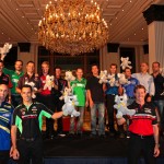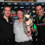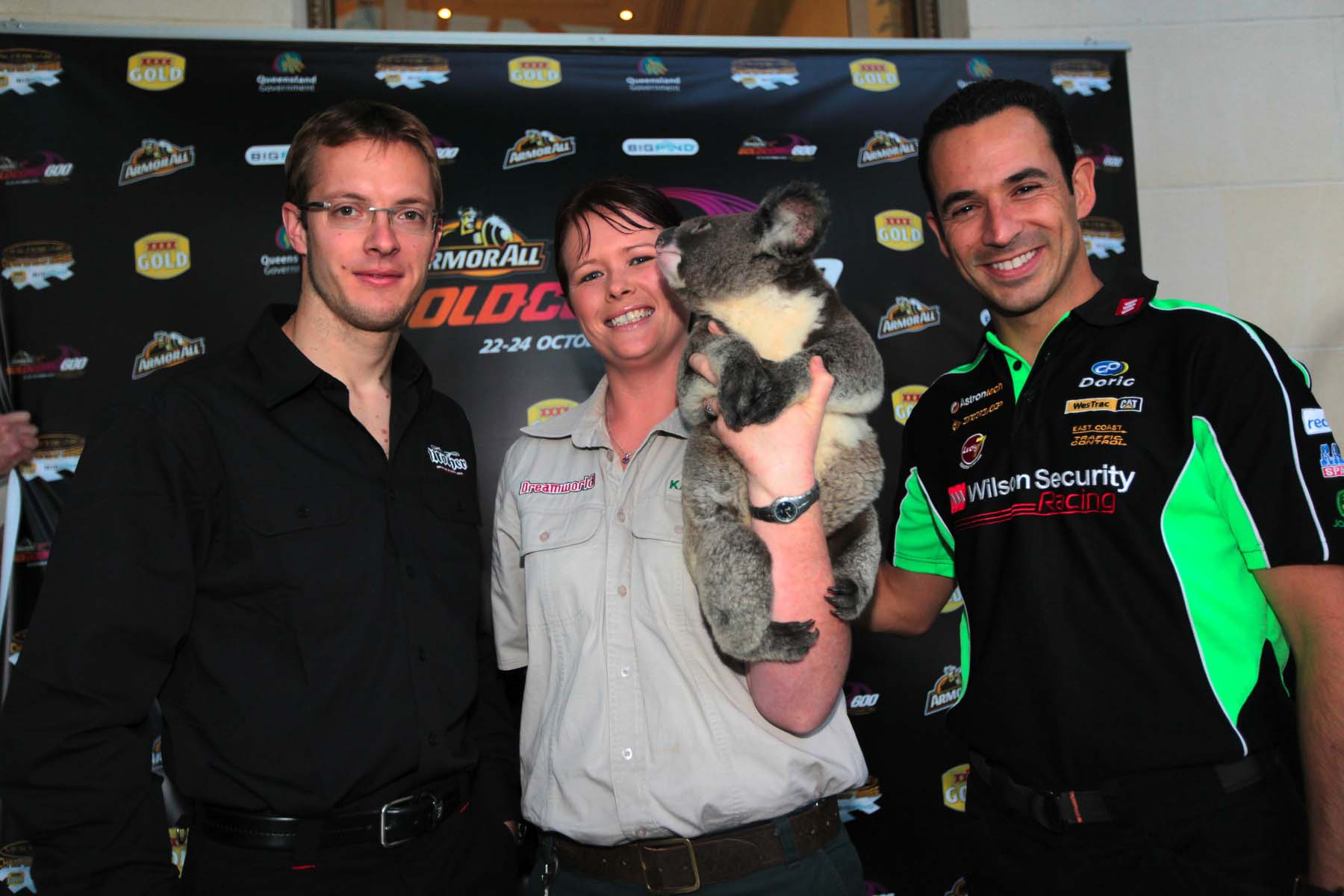 Helio Castroneves, Sebastien Bourdais (esquerda) e a representante da fundação de proteção aos coalas na Austrália (Foto EDGE PHOTOGRAPHICS)