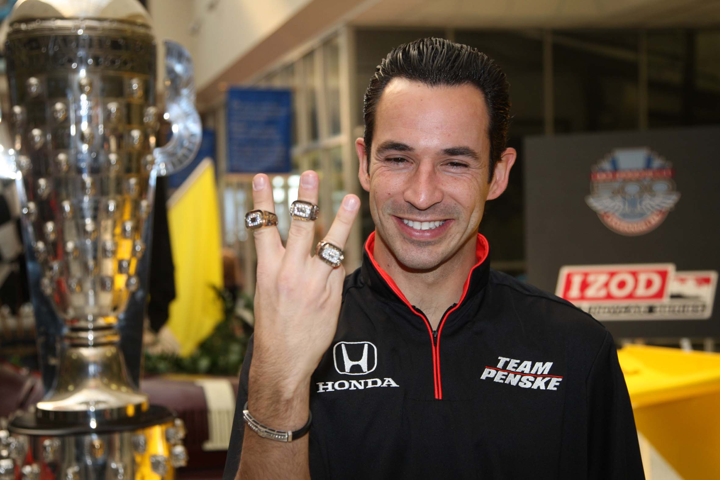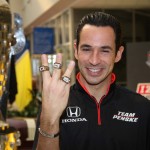 Indy 500 2010 Pré – No Museu de Indianápolis, Helio Castroneves exibe os anéis conquistados em 2001, 2002 e 2009 (Foto Ron McQueeney/IRL)