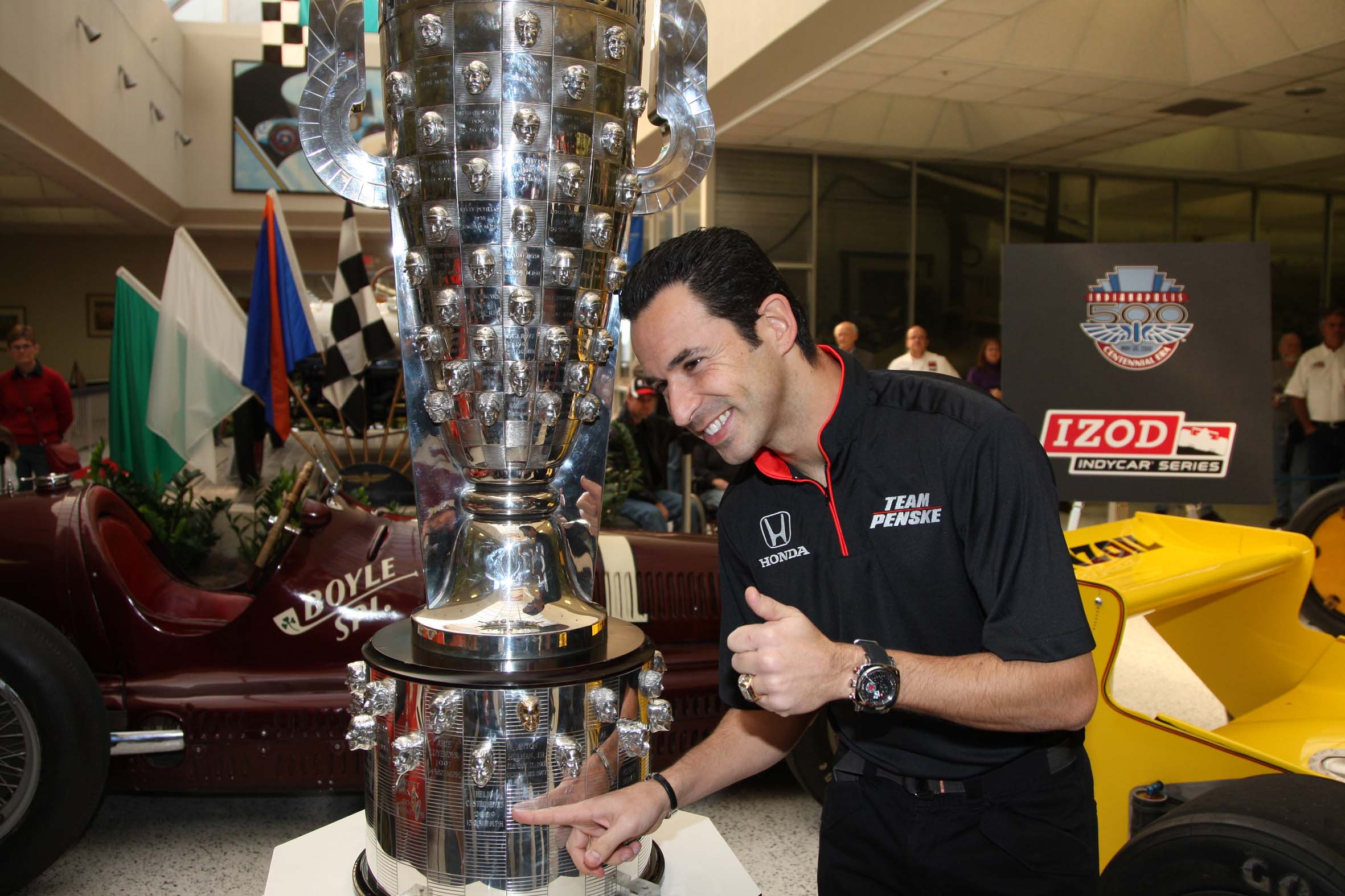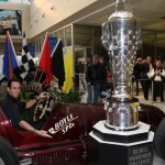 Indy 500 2010 Pré – No Museu de Indianápolis, Helio Castroneves monstra seu rosto esculpido no Borg Warner Trophy (Foto Ron McQueeney/IRL)