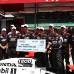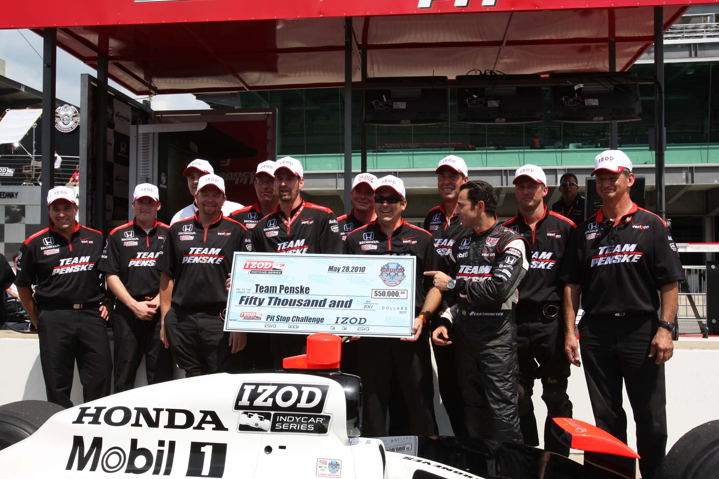 Helio Castroneves comemora com os mecânicos a quinta vitória no concurso de pit stop do piloto e seu grupo (Foto Chris Jones/IRL, Indianapolis, 28.05.2010)
