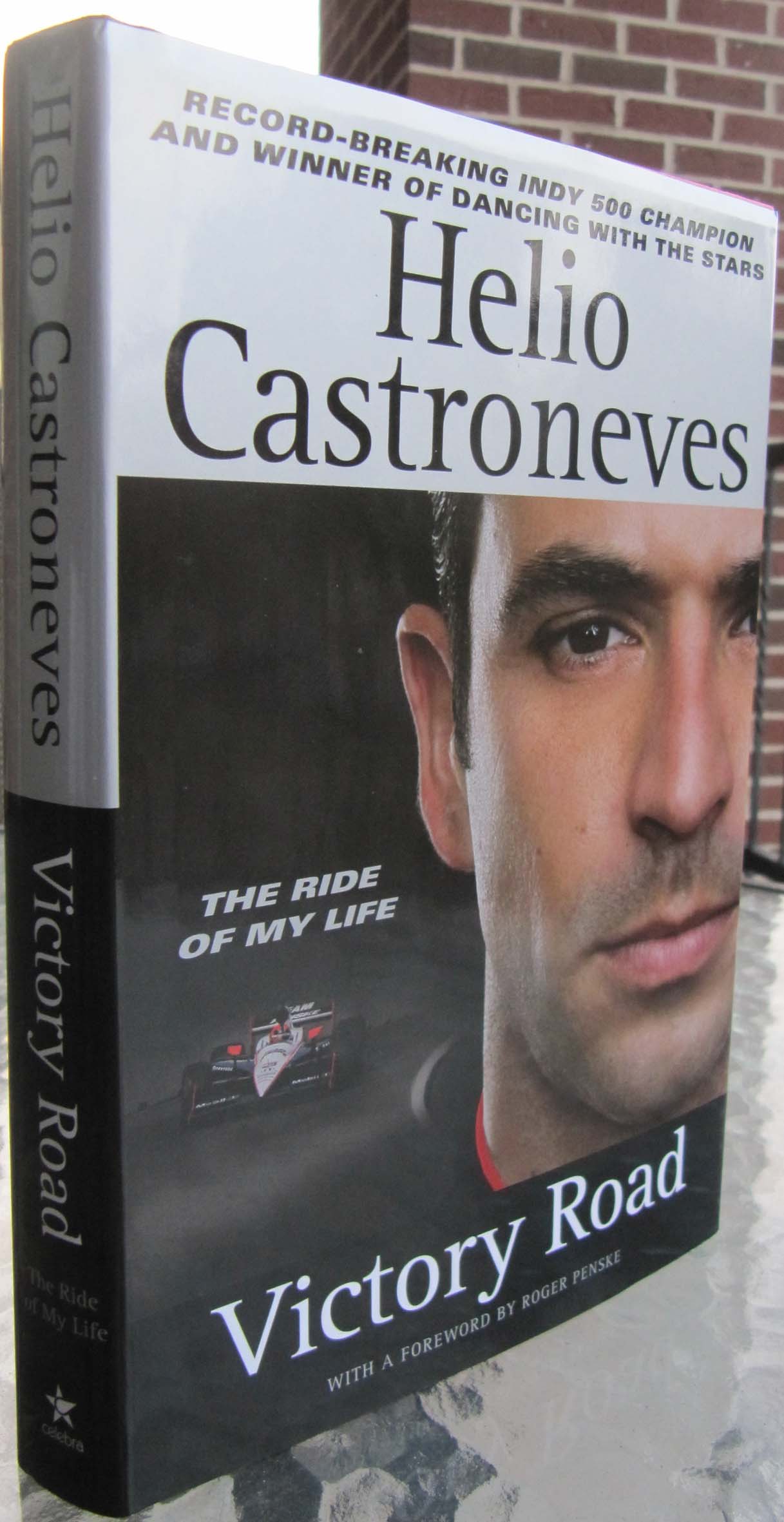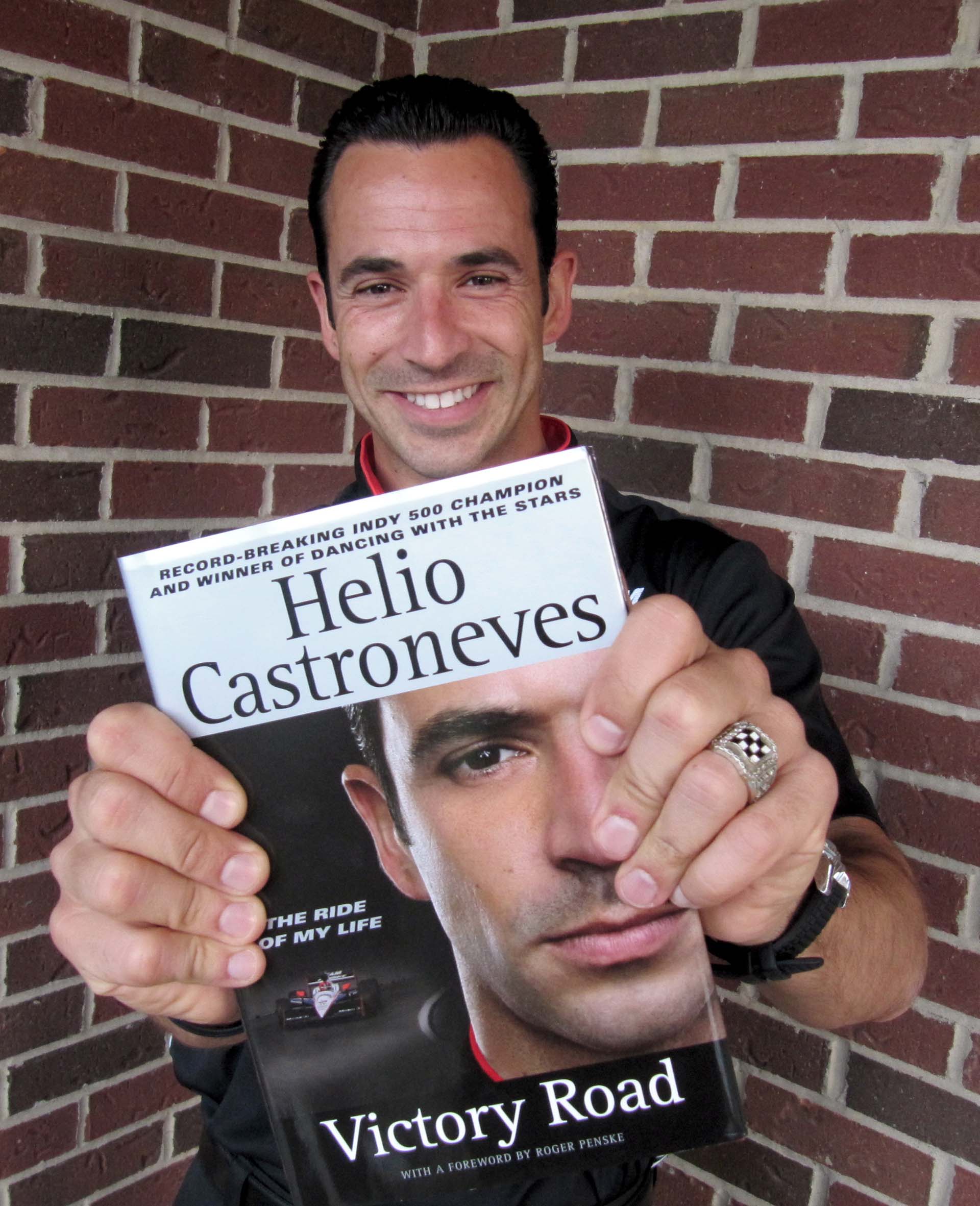 Helio Castroneves e seu livro Victory Road (Foto Eduardo Assola, Indianapolis, 26.05.2010)