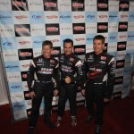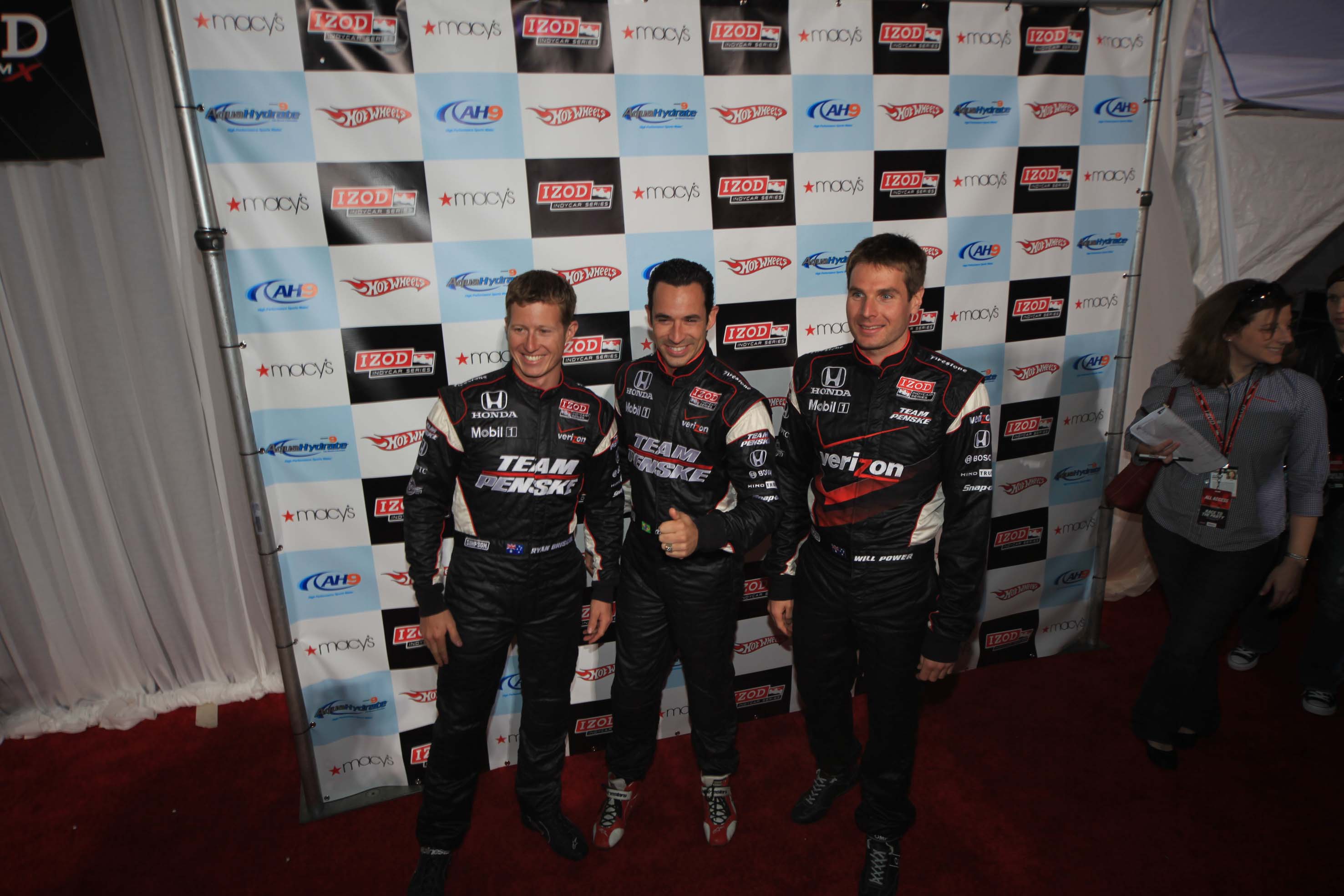 Helio Castroneves e seus companheiros de Team Penske, Ryan Briscoe (esq.) e Will Power, na Race To The Party (Foto Ron McQeeney/IRL, Los Angeles, 15.4. 2010)
