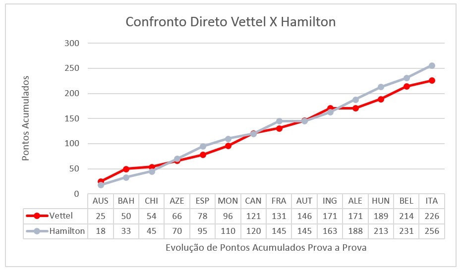 Apesar disso, o gráfico abaixo mostra que em nenhum momento da temporada houve uma vantagem tão grande entre os dois postulantes ao título, com vantagem de 30 pontos do líder Lewis Hamilton sobre Vettel. Obviamente que 30 pontos são “nada” diante dos 175 ainda em jogo, mas a diferença tende a se tornar intransponível se mantida a ocorrência de erros.