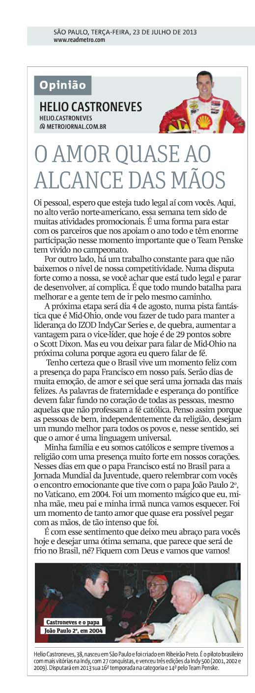 in Helio Castroneves Colunas Helio Castroneves Press Share Facebook Twitter Pinterest Email Helio Castroneves – Coluna Metro (30 de julho de 2013) on 30 de julho de 2013 30 de julho de 2013 Helio Castroneves Share This Previous Post← Coluna Helio Castroneves – Jornal METRO (23 de julho de 2013) Coluna Helio Castroneves - Jornal METRO (23 de julho de 2013) Next PostIndyCar: Etapa de Mid-Ohio será transmitida ao vivo pelo canal Band Sports e Portal da Band → IndyCar: Etapa de Mid-Ohio será transmitida ao vivo pelo canal Band Sports e Portal da Band You May Also Like on 2 de março de 2024 Coluna Helio Castroneves – “Wilson Fittipaldi Jr.”