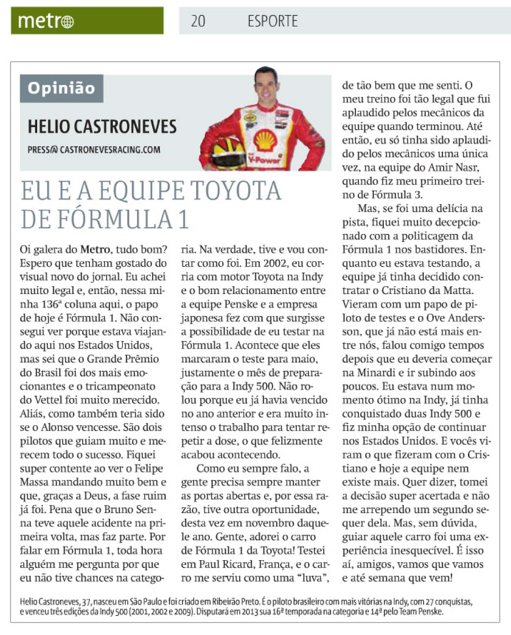 Embora o carro do próximo campeonato seja o mesmo de 2012, Castroneves explicou que há muito trabalho pela frente. “Mesmo fora do calendário de corridas, o pessoal na fábrica fica o tempo todo tentando desenvolver aqueles itens permitidos pelo regulamento e é sempre uma chance de a gente experimentar novos acertos. Além disso, vamos testar pneus”.