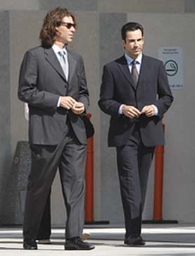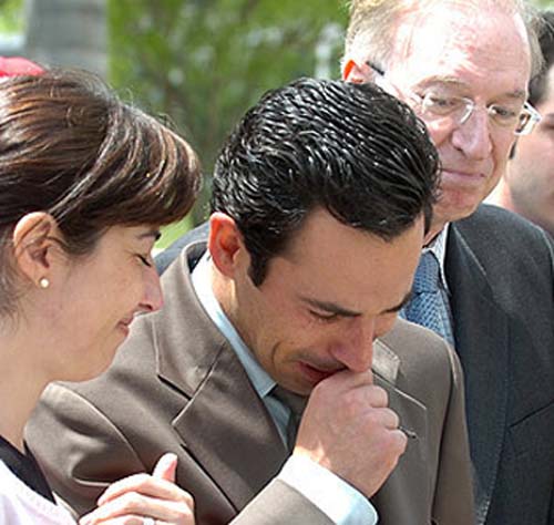 Roy Black se emociona ao lado do piloto brasileiro e de sua irmã no dia 17 de abril, quando da absolvição na Corte de Miami; Howard Srebnick (óculos escuros) com Hélio Castroneves em um dos vários dias de julgamento