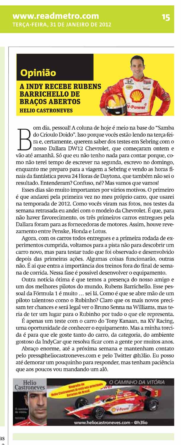 Normalmente, quando se participa de um teste, não se faz amizade com os outros concorrentes, quanto mais ajudá‑los. Oswaldo e eu seguimos pelas ruas do centro da cidade, pedindo informações durante o trajeto. Ele falava inglês um pouco melhor do que eu, pois correra na Fórmula 3 por vários anos. Phoenix era diferente de todas as cidades brasileiras e eu estava impressionado por ter de procurar um lugar bem no meio do deserto. Quando encontramos o massagista, …“.