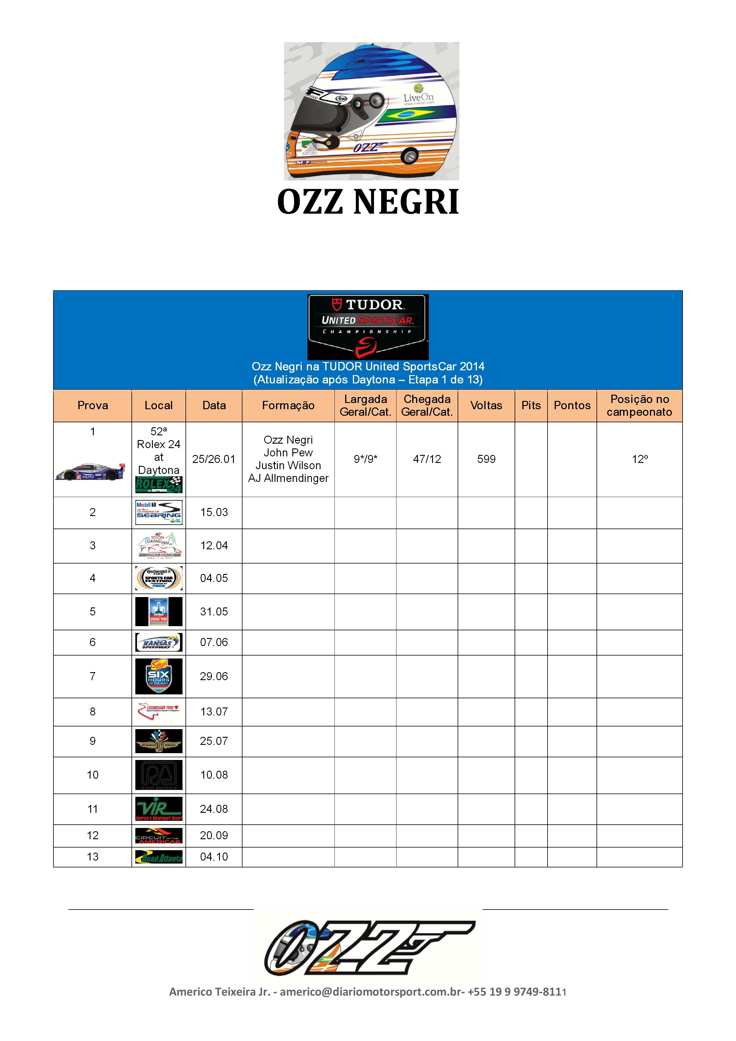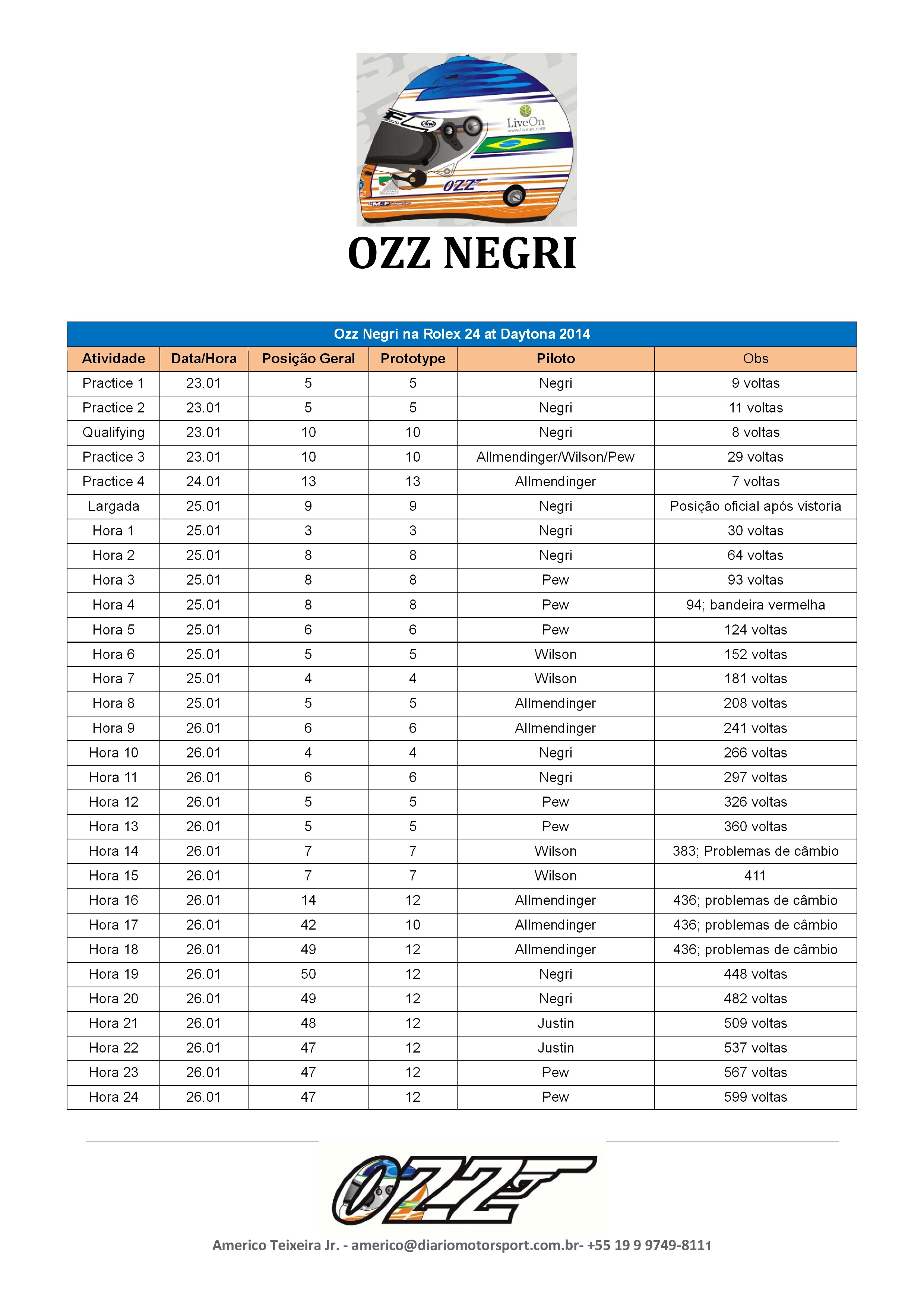 (Segunda-feira, 27 de janeiro de 2014) Apesar de todas as dificuldades enfrentadas e do resultado muito aquém do esperado, o piloto brasileiro Oswaldo Negri Junior destacou diversos pontos positivos na participação da equipe Michael Shank Racing na 52ª Rolex 24 at Daytona, disputada no sábado e domingo no Daytona International Speedway. A prova de abertura do TUDOR United SportsCar Championship foi vencida pelo trio formado pelo brasileiro Christian Fittipaldi, o francês Sebastien Bourdais e o português João Barbosa, com Corvette DP. Ao volante do Ford EcoBoost Riley #60, o quarteto formado por Negri, o inglês Justin Wilson e os norte-americanos John Pew e A. J. Allmendinger completou 599 voltas e fechou a disputa em 12º lugar na categoria Prototype, 47º na geral. O resultado adverso, bem diferente da vitória conquistada em 2012 pela mesma formação, foi gerado fundamentalmente por problemas de câmbio. Entre reparos da primeira marcha e troca do equipamento que ameaça estourar, a equipe perdeu em torno de três horas na garagem ou exatas 96 voltas. Por outro lado, em razão de a vitória ou mesmo um pódio se mostrarem fora de alcance, a equipe mostrou muita determinação rumo ao objetivo de concluiu a primeira participação do novo motor Ford EcoBoost em Daytona. Mesmo com toda essa desvantagem, todos os pilotos foram para a pista e os tempos de voltas sempre estiveram no mesmo nível dos líderes da prova. Aliás, essa foi a tônica até depois da metade da maratona (VER QUADRO), quando o Ford EcoBoost Riley # 60 esteve entre os primeiros durante as 16 primeiras horas da prova e, inclusive, liderou por diversas voltas, no início da noite de sábado, com Justin Wilson. Os problemas de câmbio tiraram da gente a chance de, pelo menos, lutar até o fim pelo pódio. Além disso, a força, a determinação e a garra da nossa equipe, que simplesmente não desiste, mais uma vez ficaram provadas. Os rapazes trocaram o câmbio duas vezes em tempo recorde e colocaram o carro na pista para que o A. J. completasse o seu stint, passasse o carro para mim, o Justin e fosse levado à bandeirada pelo John”, disse Ozz Negri, que completou sua 10ª participação na Rolex 24 at Daytona. Vocês podem até se perguntar o motivo de tanta dedicação para, na prática, não ganhar posições na nossa categoria. Quanto o carro voltou, estava em 50º na geral e 12º na Prototype. O resultado foi o avanço de três posições na geral e ficamos na mesma na categoria. Não é uma regra escrita, mas há uma verdade absoluta na Michael Shank Racing de nunca, jamais desistir. Aqui, o ‘Don’t give up’ (Não desista) é uma espécie de algo orgânico que corre nas veias de todos os membros da equipe, numa velocidade incrível, que assegura motivação total até a bandeirada, independentemente de estarmos em 1º ou último” acrescentou Ozz. Ele ressaltou, ainda, que: “Parceria é parceria, em qualquer situação. O pessoal da Ford Racing trabalhou demais em Detroit e tivemos a primazia de levar o motor Ford EcoBoost, em sua primeira corrida, até o final”.    A segunda etapa do Tudor United SportsCar Championship acontece no Sebring International Raceway, em 15 de março, com a realização da Mobil 1 – 12 Hours of Sebring. Antes disso, porém, haverá no local dois dias de teste para a categoria. As datas são 20 e 21 de fevereiro. Veja ainda… Ozz Negri Website Oficial Ozz Negri Galeria de Fotos Ozz Negri Twitter Ozz Negri Facebook Calendário Tudor United SportsCar Championship