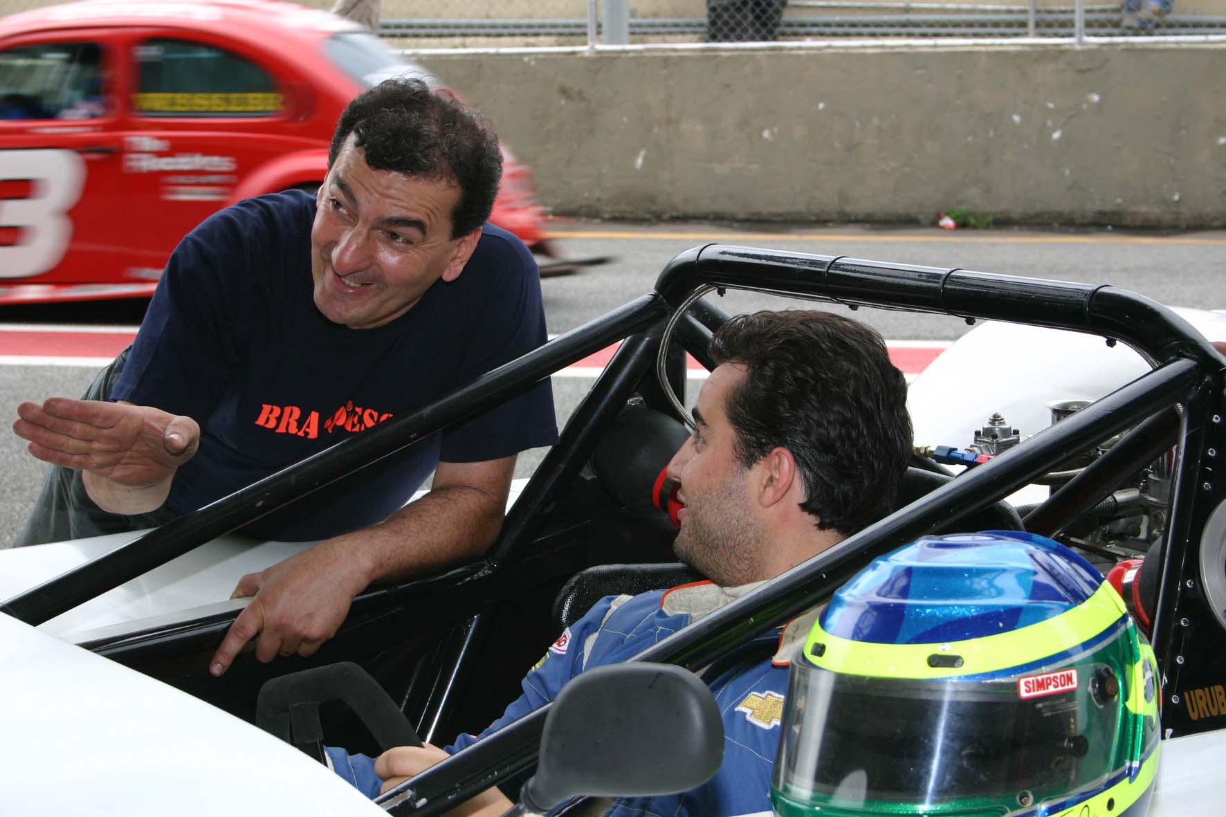 Ao alto, o Alfran Braspress 450 A, em Interlagos, pouco depois de ter estado na pista pela primeira vez; Ao lado, João Alfran passa orientações para Helou Jr., no cockpit