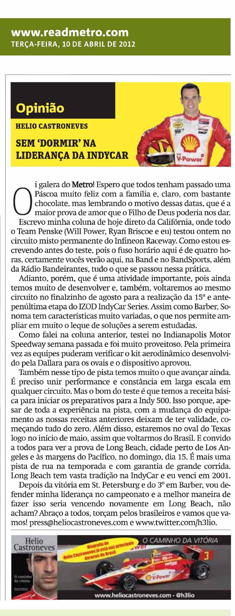 Coluna nº 104 de Helio Castroneves – Jornal METRO (10.04.2012)